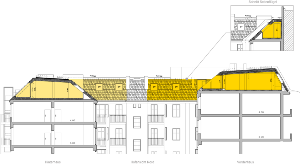 The attic blank is sold in the actual condition (undeveloped) to a buyer including building permit. The development is reserved for the respective owner of the attic.