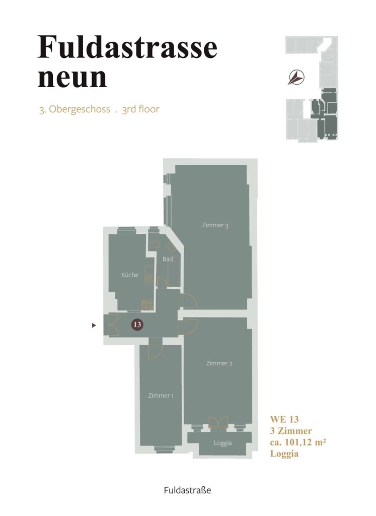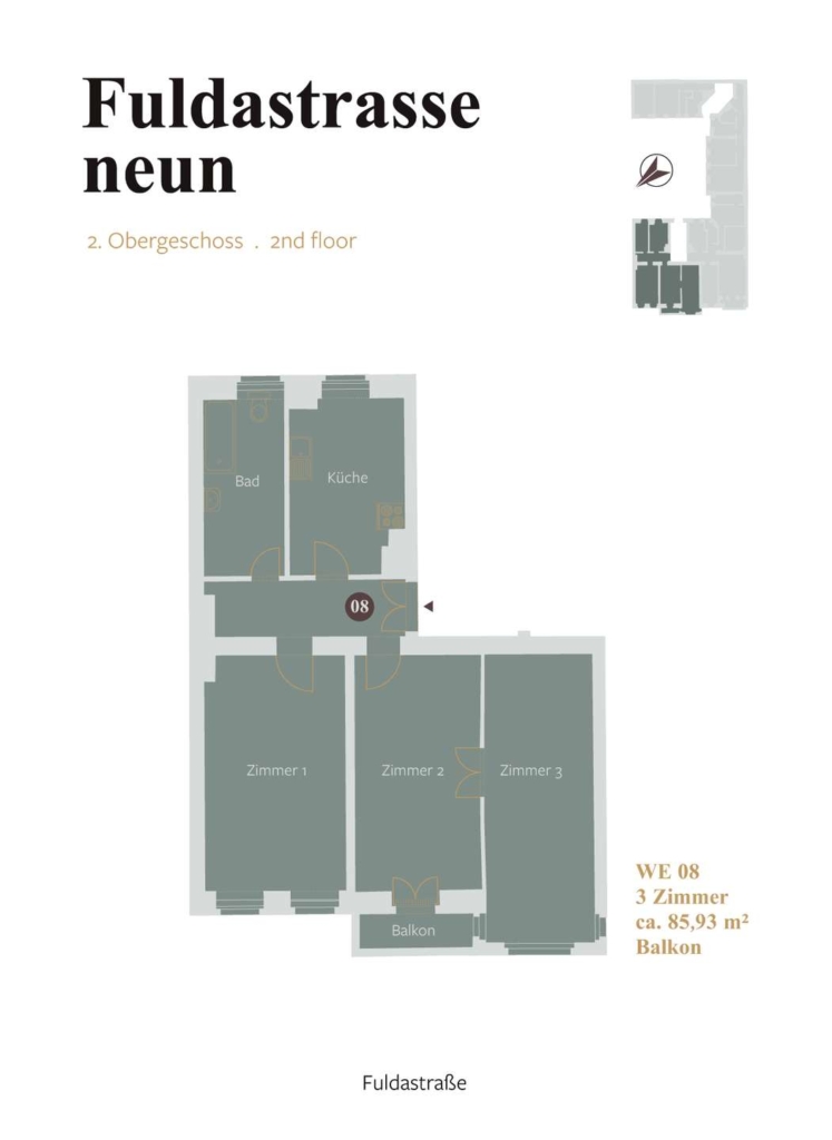 On the ground floor and four upper floors, the the property offers on clearly structured floor plans a total of 16 residential units with 1 to 3.5 rooms and and 3 commercial units with up to eight rooms. Balconies with a view of the Fuldastraße can be found in all apartments from the first to the fourth upper floor in the front building. From the rooms of the units in the rear building have a view into the landscaped inner courtyard.