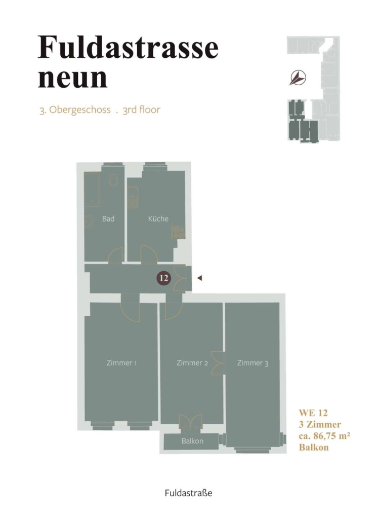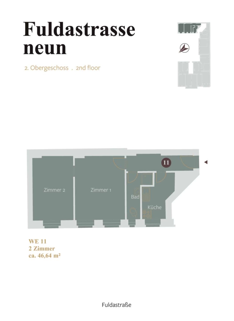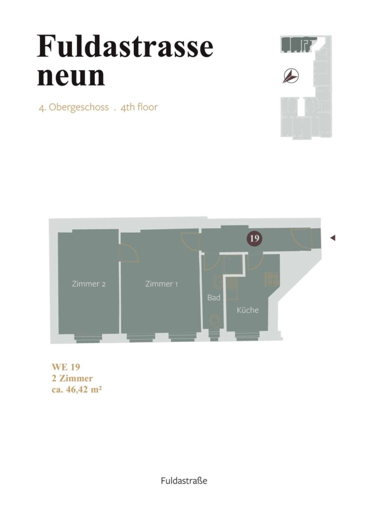 On the first floor and four upper floors, the property offers a total of 16 residential units with 1 to 3.5 rooms and 3 commercial units with up to eight rooms on clearly structured floor plans. Balconies with views of Fuldastrasse can be found in all apartments from the first to the fourth floor in the front building. The rooms in the units in the rear building have a view of the leafy inner courtyard.