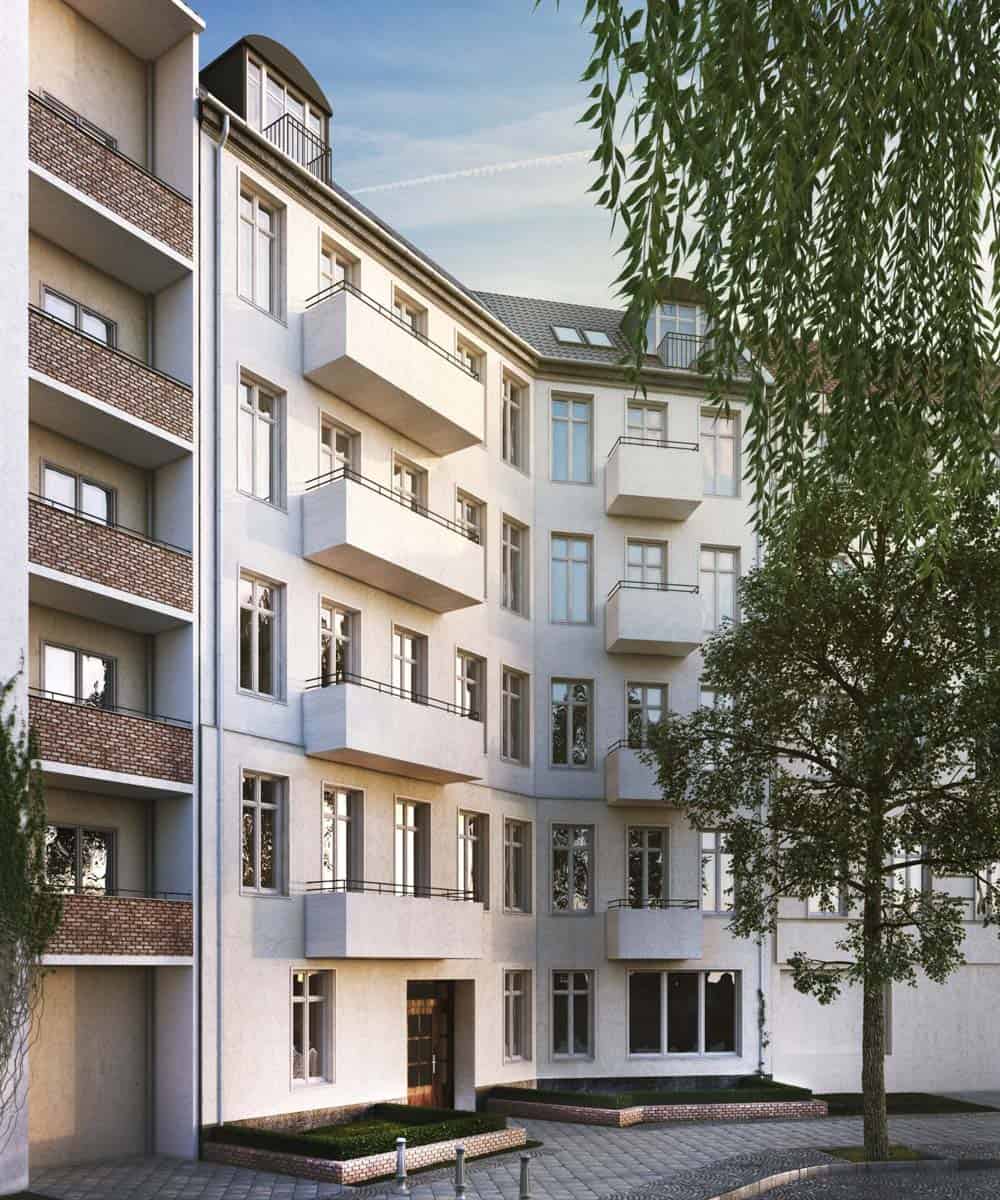 Berlin-Wilmersdorf is simply a great place to live. Families, singles, students and pensioners enjoy the feel-good idyll and metropolitan flair here. The residential building at Bruchsaler Strasse 4 is a classic old building. The entrance areas and stairwells were designed in an industrial chic style. The façade surprises with decorative finesse. The inner courtyards are landscaped and offer residents a break from the hustle and bustle of city life. Each apartment has its own balcony. Living comfort is further enhanced by elevators in each stairwell.