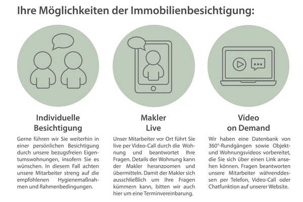 Um Ihnen weiterhin Besichtigungen zu bieten, hat unser Team die klassische Besichtigung um digitale Möglichkeiten erweitert. Hierbei erhalten Sie z.B. per Live-Videobesichtigung einen ersten Eindruck vom Objekt. Sie können sich von Zuhause aus durch die Immobilie führen lassen und unseren MitarbeiterInnen direkt Fragen stellen. Mit unserer Online-Reservierung kann mit wenigen Klicks papierlos die Wohnung reserviert und auch zu Corona-Zeiten der Immobilienkauf weiter verfolgt werden.
