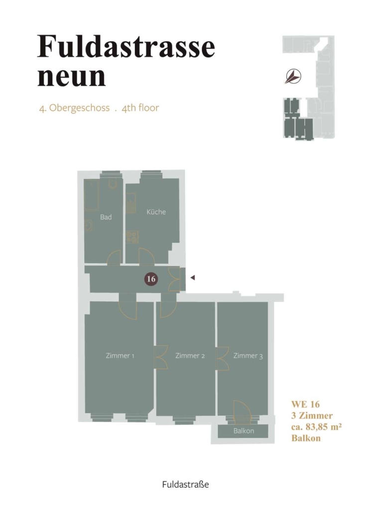 Auf Erdgeschoss und vier Obergeschossen bietet die Liegenschaft auf klar strukturierten Grundrissen insgesamt 16 Wohneinheiten mit 1 bis 3,5 Zimmern und 3 Gewerbeeinheiten mit bis zu acht Räumen. Balkone mit Blick in die Fuldastraße finden sich in allen Wohnungen vom ersten bis zum vierten Obergeschoss im Vorderhaus. Von den Zimmern der Einheiten im Hinterhaus hat man einen Blick in den begrünten Innenhof.