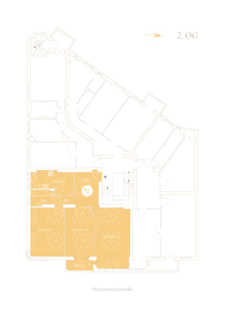 Nicht nur als „point de vue“ zur einmündenden Eschenstrasse zieht das Haus Stubenrauchstraße 48 die Aufmerksamkeit auf sich. Es ist die individuell komponierte Fassadenarchitektur, welche sich harmonisch in das Straßenbild einfügt und durch die Asymmetrie der Gestaltungselemente einen eigenen Charakter entwickelt.