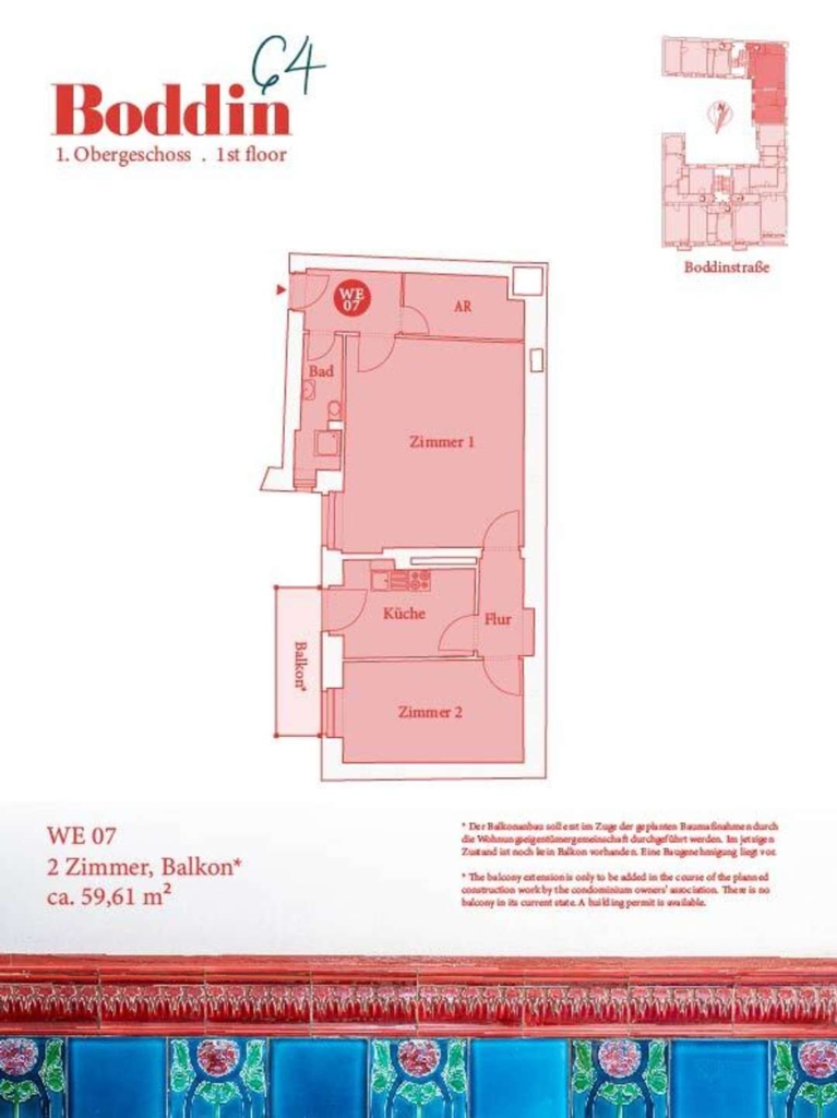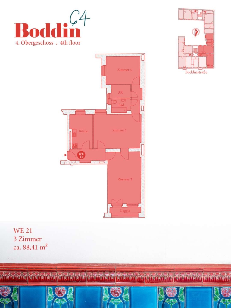 Das in den Anfängen des 20. Jahrhunderts errichtete Mehrfamilienhaus in der Boddinstraße 64 besteht aus Vorderhaus, Seitenflügel und Hinterhaus, die in klassischer Blockrandbebauung errichtet sind und sich um einen begrünten Innenhof gruppieren. In zurückhaltender Anmut zeigt sich die schöne straßenseitige Fassade, deren Stuckverzierungen Stilelemente des Jugendstils und des Art Déco aufgreifen. Erker und Balkone lockern hierbei das Fassadenbild auf und heben die gutbürgerliche Beschaulichkeit des Berliner Altbaus hervor. Treppenhaus und Hauseingang bestechen durch klare Formensprache mit zartem Stuck und floralen Details in Geländern und historischen Fensterverglasungen.