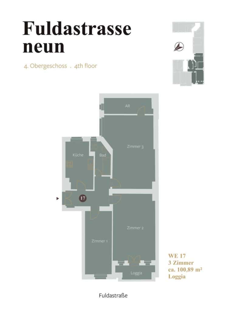Auf Erdgeschoss und vier Obergeschossen bietet die Liegenschaft auf klar strukturierten Grundrissen insgesamt 16 Wohneinheiten mit 1 bis 3,5 Zimmern und 3 Gewerbeeinheiten mit bis zu acht Räumen. Balkone mit Blick in die Fuldastraße finden sich in allen Wohnungen vom ersten bis zum vierten Obergeschoss im Vorderhaus. Von den Zimmern der Einheiten im Hinterhaus hat man einen Blick in den begrünten Innenhof.